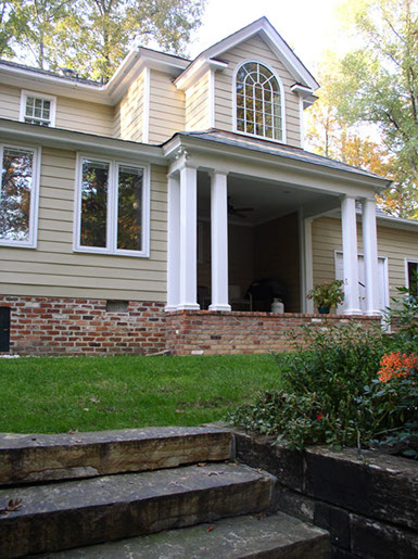 The main purpose of the project was to add a larger second-floor bathroom for the master suite. The clients, however, did not need any additional space on the first-floor. The solution was to add a covered porch to the rear-side of the house, which would then support the new bathroom above.